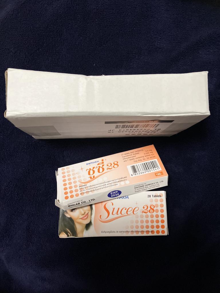 スーシー28(Sucee28)には、黄体ホルモン作用として酢酸シプロテロン、卵胞ホルモンとしてエチニルエストラジオールが含まれています。この2成分の定期服用により、排卵の抑制・受精卵の着床抑制・精子の子宮内進入抑制などの作用を示し、妊娠を防ぎます。また酢酸シプロテロンは黄体ホルモン作用に加えて、抗アンドロゲン作用と呼ばれる働きを有しています。アンドロゲン(男性ホルモン)の産生抑制作用や、アンドロゲン(男性ホルモン)受容体の阻害作用により、アンドロゲン(男性ホルモン)依存性のニキビや多毛を改善するとされています。