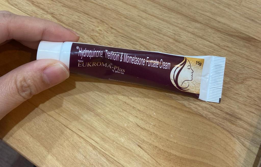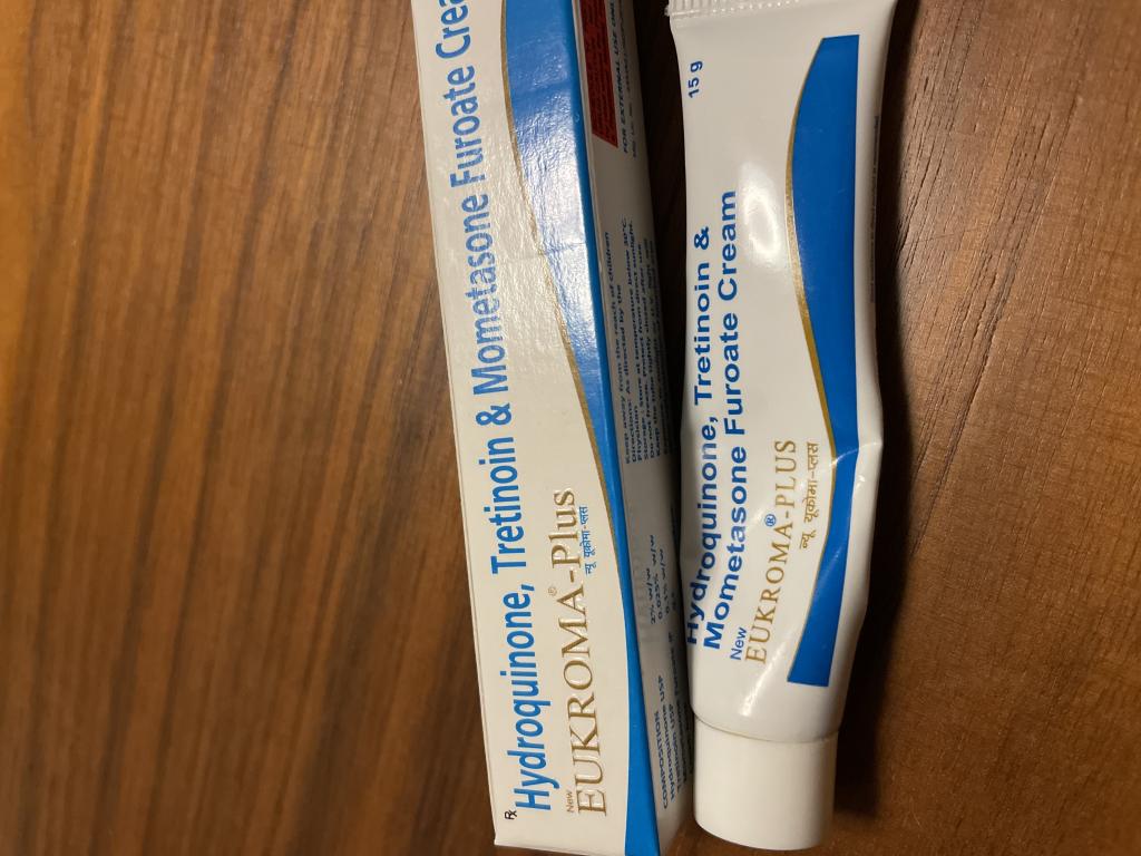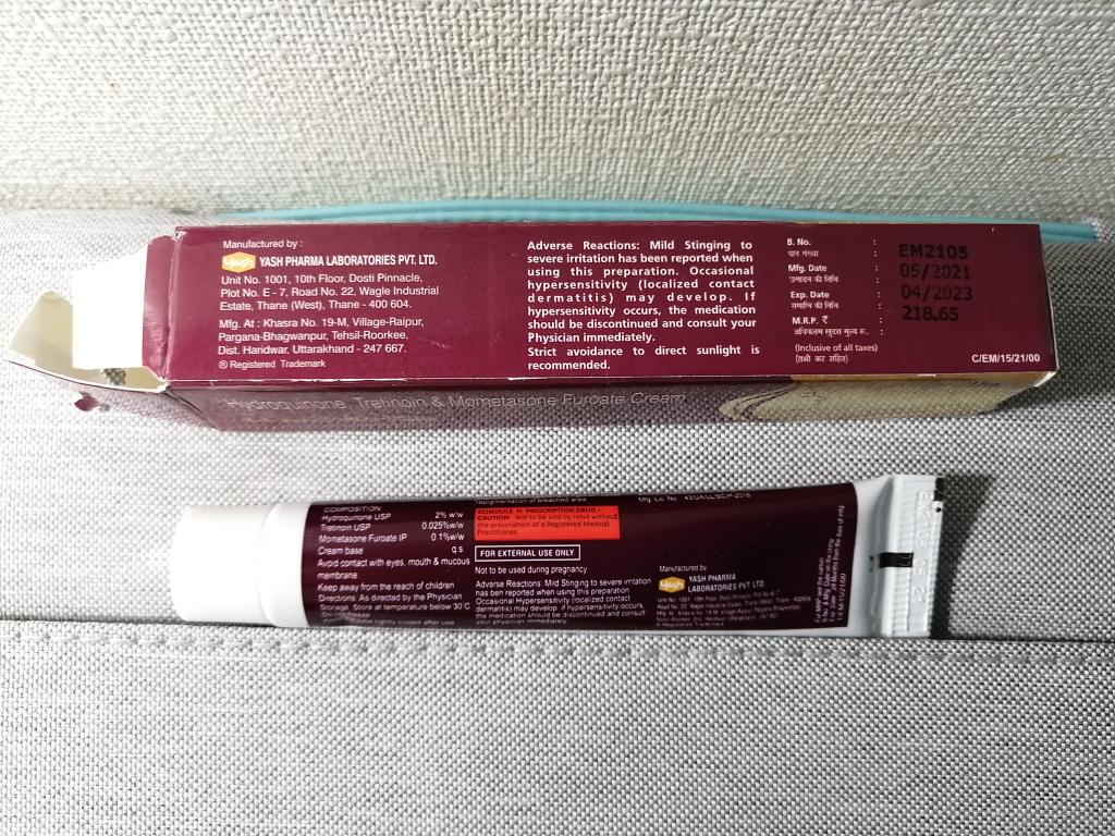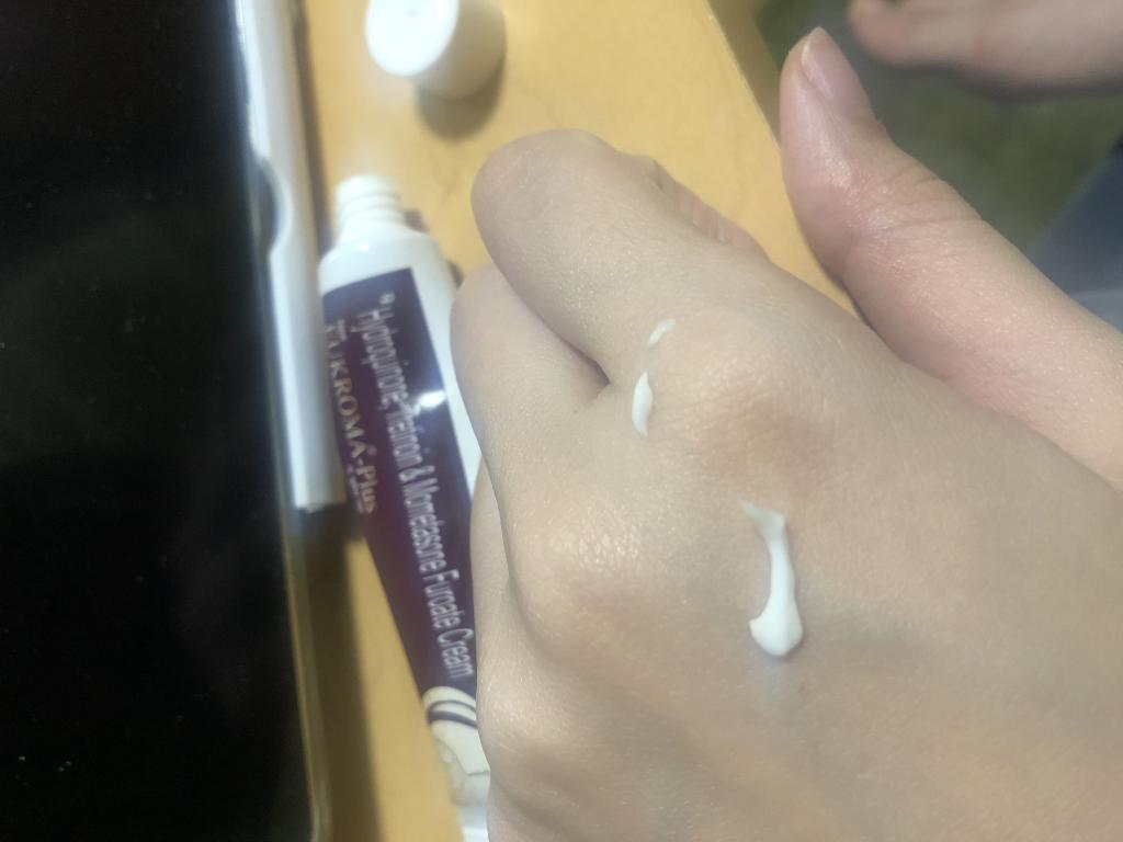 ハイドロキノンに加えて、肌のターンオーバーを促すトレチノインが入っています。トレチノインは皮が向けやすくなる反面、肌が赤くなりやすいので、炎症を抑えるモメタゾンも入っています。